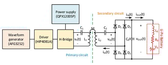 Figure 1 shows the schematic representation of the SS compensated ICPT system investigated in this paper. The primary circuit consists of an inverter based on the H-bridge properly driven by the waveform generator. The secondary circuit mainly consists of the diode rectifier bridge and the LC-filter. However, only the passive component is physically present in the circuit, as mentioned above. Besides, and are the battery stray resistance and inductance, respectively, according to the Randal’s model evaluated at the frequency of interest [15]. The frequency response of the LC-filter consisting of in parallel with the parasitic impedance of the battery can be determined.