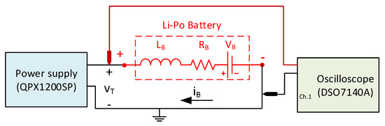 Figure 2 shows the experimental set-up used to measure the battery series resistance. The two terminals of the Li-ion battery were connected to the QPX1200SP power supply configured as current generator and to the DSO7140A oscilloscope. The battery was subjected to a pulsed current test (PCT). This test is usually adopted to extract the characteristic parameters of a Li-ion battery [21,22]. It consists in applying to the battery a current pulse for a given time, followed by a rest period. The current pulses and the rest periods are usually repeated at specific state of charge (SoC) values. is calculated by measuring the amplitude of the battery voltage drop due to the current pulse and dividing it by the current pulse amplitude. The PCT was limited to only one current pulse in our case. One value of is only needed, so the long time relaxations and the variations with SoC are neglected. The QPX1200SP delivers the current pulse to the battery, and the oscilloscope captures its voltage response. The voltage drops for both the rising and falling edges of the current pulse were measured, and the battery series resistance was evaluated averaging the two resulting values. The procedure is indicated in Equation (7), where and are the average of the voltage drops and the current pulse amplitude, respectively.