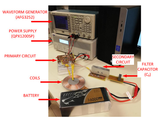 A prototype of the ICPT system represented in Figure 1 was designed and realized to validate the time-domain simulation analysis. A photograph of the prototype utilized for the validation of the simulation results is shown in Figure 4.
