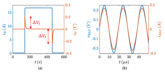 Terminal voltage and current of the battery during the pulsed current test used to extract the series-resistance, as acquired by the oscilloscope. The voltage probe was AC coupled to improve the accuracy of the voltage drop measurement (a). Voltage and current waveforms of the circuit used to measure the battery stray inductance when in resonance (b).