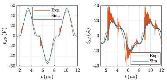 The experimental results obtained from the prototype of the wireless ICPT circuit described above are illustrated in this section. First of all, the waveforms of the voltage and the current measured at the bridge rectifier input are introduced. They are shown in Figure 7 and are superimposed to the simulation outputs. The measurements and the simulations fit quite well one to the other, even if the measurements are affected by some noise, particularly on the current signal. In any case, the results confirm the validity of the approach and the simulation analysis first introduced in [16]. The experiment refers to a secondary circuit configured with to obtain the maximum power transfer, as will be described afterwards.