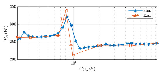 The power transferred to the battery in the circuit prototype is shown in Figure 8. The output capacitance was the dependent variable parameter in this case. The dots show the discrete values of in which the power was calculated in the diagrams of both the simulation and experimental analysis. The horizontal bars indicate the tolerance of the commercial capacitor used in the experiments (red line).