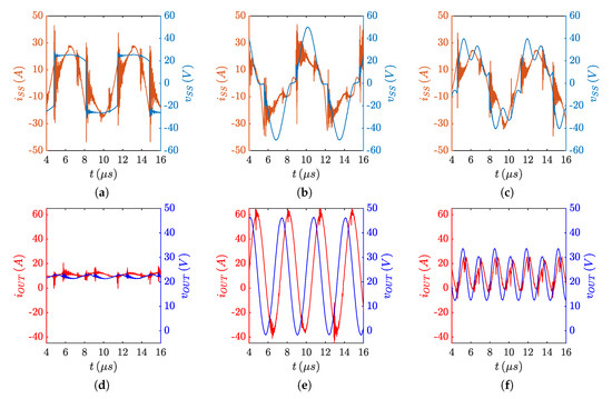 Instead, the second diagram shows the voltage and current measured on the circuit shown in Figure 3 when it was resonant. The RLC-network resonant frequency was 51 kHz, so that the battery inductance calculated according to Equation (8) was 340 nH. Finally, the value that separates the complex-conjugate and real poles zones was 6 mF. It was calculated according to Equation (2) and the battery parameters extracted above.