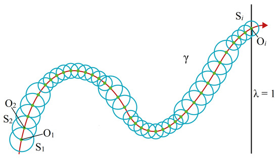 The algorithm changes values after each iteration, that is, updates the center value; in addition, some curve segments may have very closed return points, then, radius values vary to prevent reversal of jump issues between homotopic curves [35,37]. Figure 3 shows this adjustment based on this method. To avoid complications when designing the spheres and maintaining the homotopic trajectory, the method uses a predictor-corrector model complementing the spherical tracking.