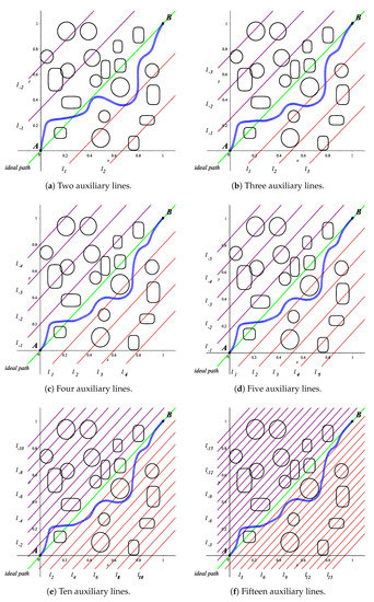 Tests were carried out with five auxiliary lines and more (Figure 4d–f). As a result, regions influence on repulsion parameters remains effective, although the time required for the algorithm to assign values after the sweep of positions for each obstacle with respect to the auxiliary trajectories exceeds the main algorithm’s execution time.