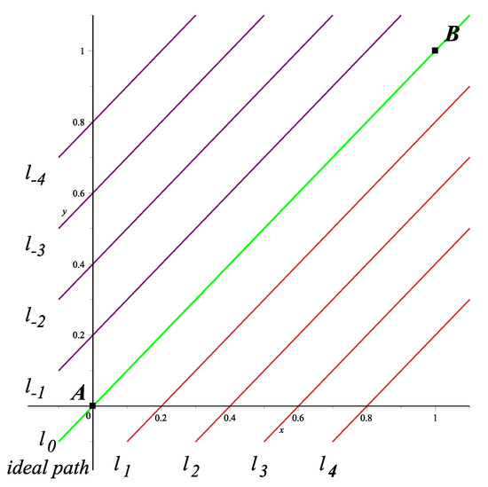 To assign the repulsion parameter, it is necessary to know the initial point (A) and goal position (B); then, we can define an ideal path, represented by a straight line, between these two points (). In addition, we define a set of auxiliary straight lines which are parallel and equidistant to the ideal path. These paths are defined as