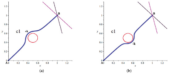 Relationship between k sign value and the resulting path. (a) Obstacle avoidance due to a positive k value; (b) Obstacle avoidance due to a negative k value.