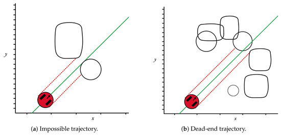 Due to the proximity between obstacles, repulsion parameters may cause conflicts on the path; this may lead to finishing at indefinite trajectories or dead-ends (Figure 7a,b). Therefore, it is necessary to group sets of contiguous or close obstacles that the path may encounter or pass nearby to try to avoid these problems.