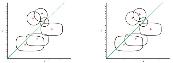 As can be seen in Figure 8a, there is a neighbourhood with sign conflict; obstacles located above the ideal trajectory show a negative repulsion parameter while obstacles located below the ideal trajectory have a positive repulsion parameter assigned to them. In order to avoid a path planning issue, the obstacle with the largest area provides its sign (positive or negative) as the dominant sign of the neighbourhood; this means that every obstacle within this neighbourhood has the same sign; forcing the path planning method to surround them all as if they were a single obstacle (Figure 8b).
