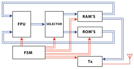 The implemented program in the FPGA consists of an arithmetic floating-point unit (FPU), a set of ROM memories that store obstacle position data, a set of RAM memories to store intermediate results of calculations from the homotopic system, and the values of the resulting homotopic path; all these elements are controlled using a finite state machine (FSM) that synchronizes the application of every methodology step described in this work (Figure 9).