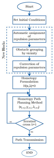 - DeCos-Cholula, H.E.; Díaz-Arango, G.U.; Hernández-Martínez, L.; Sarmiento-Reyes, A. An Homotopy Path Planning Method with automatic fixed value assignation of repulsion parameter for mobile robotics. In Proceedings of the 2016 13th International Conference on Electrical Engineering, Computing Science and Automatic Control (CCE), Mexico City, Mexico, 26–30 September 2016; pp. 1–6. [Google Scholar]
