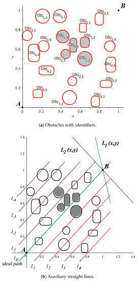 where i turns into k; k takes integer values ranging from (for obstacles above the ideal path) to 4 (for obstacles below the ideal path). Taking this into account, when , this represents the value of the ideal path (Figure 5).