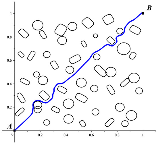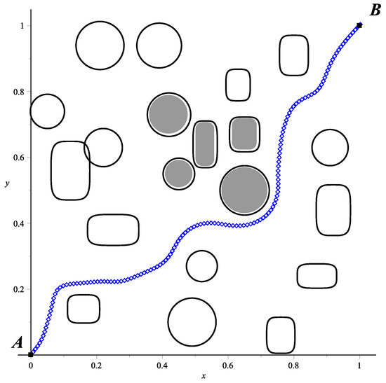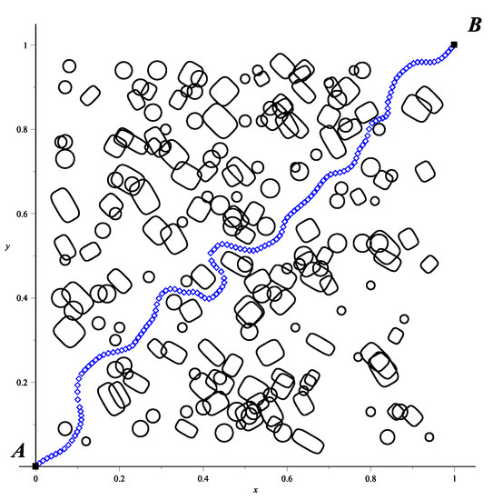 where are the coordinates of the center of the i-th rectangular obstacle, and the base and height approximations approach and , respectively, as tends to infinity; for this study, defines the vertices of each rectangle. Supported by these descriptions, the set of obstacles in [31] are expressed through: