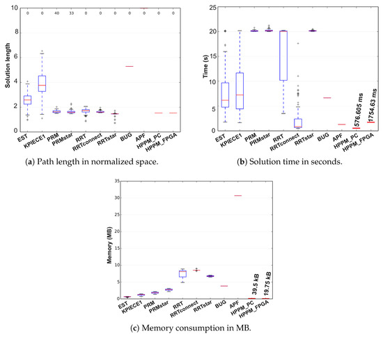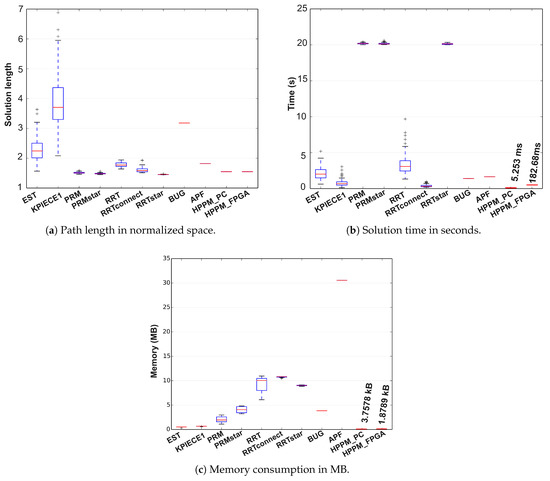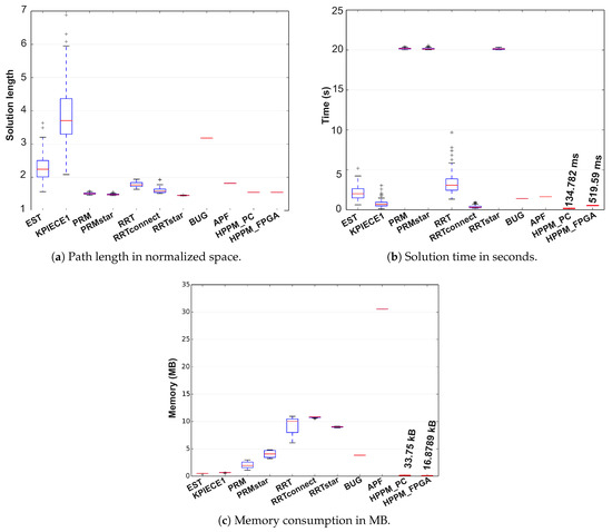 As can be observed, FPGA implementation of HPPM remains as the best option for a path planning method in terms of memory consumption, while keeping itself as a competitive method in terms of distance and solution time. In general terms, the methods that obtain slightly smaller distances than HPPM face the problem of requiring noticeable higher execution times and memory consumption. Therefore, HPPM is an ideal algorithm for embedded systems.