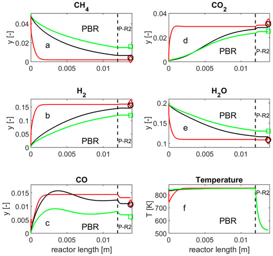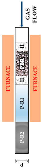 The exit line from the reactor was also simulated. In this case, the empty pipes P-R1 and P-R2 were simulated by applying a steady-state, non-isothermal plug flow reactor (PFR) approach, consisting in practice of the same local mass (Equation (7)) and energy (Equation (8)) balances employed for the PBR simulation. The global heat transfer coefficient U was also evaluated in P-R1 and P-R2, using the same definition employed for the PBR reactor (Equation (10)). For Nu, Re and Pr, the definitions given in Equations (11)–(13) apply, with L being the tube hydraulic diameter. The evaluation of h was based on the evaluation of Nu. For an empty tube, with constant wall temperature and with laminar fluid flow regime as in the present case, Nu is constant, equal to 3.66 [37]. The effective thermal conductivity coincides with the thermal conductivity of the gaseous mixture kf [39].