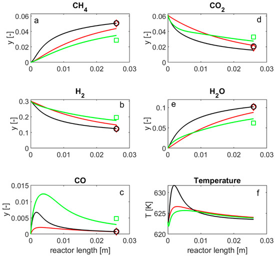 The proposed values for the coefficients ζ1 to ζ6 are reported in Table 3. ζ6, i.e., the adjusting coefficient for the H2O adsorption coefficient, was about two orders of magnitude higher for the commercial catalysts than for the laboratory-made catalyst, and this is in line with the expectations, considering that the commercial catalysts have Ca and K added in order to promote H2O adsorption. Regarding the activation energies of the SMR and WGS reactions, the adjusting coefficients ζ4 and ζ5 proposed in this work are similar to those published in [33], where values corresponding to ζ4 = 1.07 and ζ5 = 1.33 are reported. In the same work, the activation energy of the GRR reaction is was multiplied by a factor of 0.97, while in our case the multiplying coefficient was 1. The catalyst employed in [33] is a 18 wt % NiO supported on α-Al2O3 provided by Johnson Matthey Plc, tested for SMR and GRR at temperatures around 600 °C, for WGS around 300 °C. Thus, we can conclude that the values proposed here for the adjustable coefficients of the local kinetics model are consistent with those reported in the literature for similar catalysts.