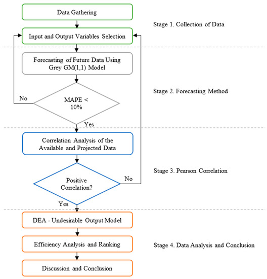 DEA models are used to measure the efficiency coming from data currently available. There can be no measurement of future efficiencies but only can measure the past up to the present scores. Wang et al. [38] use GM (1,1) along with DEA to measure the future efficiency performances of some Vietnamese ICT firms. The grey forecasting method is a time-series prediction model that does not require enormous amounts of data to be able to produce highly accurate results [39]. This capability of GM (1,1) have made it become a popular forecasting tool for many studies which this paper will also utilize and combine with the DEA undesirable output model.