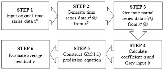 The GM (1,1) grey prediction model is a widely used forecasting method associated with time series and differential equations. One advantage of this method is the requirement of few historical data, at least four successive data with intervals that are equally distributed in a timely manner, to generate an acceptable prediction and calculated efficiently as discussed by Julong [39] and supported by Tseng et al. [40]. The procedure for grey prediction is shown in Figure 2 below.