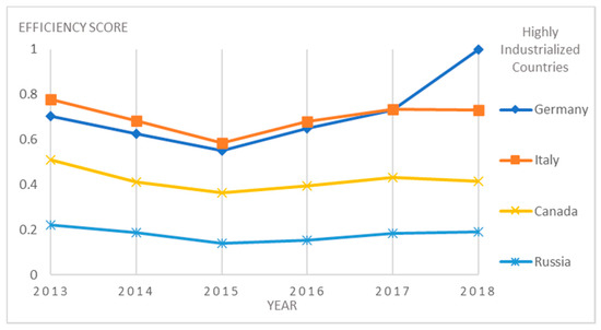 It can also be noticed that all of them have declining efficiencies from 2013 to 2015. After this period, it can be observed that most of these countries have increased their efficiencies from 2015 to 2017. However, Japan’s score dropped again until 2018. Germany shows a huge increase in their technical efficiency, achieving a score of 1 at the end of 2018.