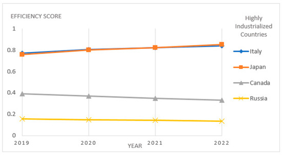 Figure 5 does not include the countries that obtain an efficiency score of 1 through the whole period of 2019 to 2022 as they are understood to be highly efficient already. It can be observed that Italy and Japan display a quite positive trend, with a slight increase in efficiency, while Canada and Russia have a slightly negative trend.