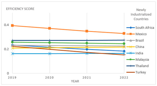 Efficiency scores of the NICs are mostly around of below a 0.5 level, except for Indonesia which garnered a score of 1.0 from 2019 to 2022. None of the countries show any remarkable positive trends. Instead, some countries like China, India, and Thailand are expected to display stable performance or very little improvement in efficiency. Mexico, Thailand, and Turkey will have declining efficiencies during the projected period, as seen in Figure 6.