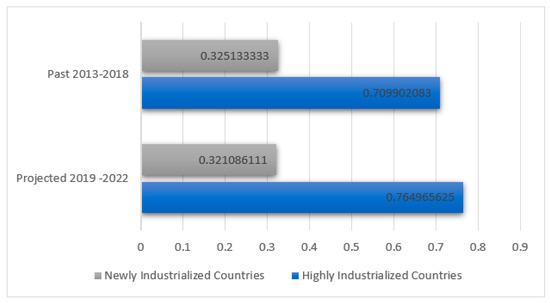 As presented in Figure 7, the calculated average efficiencies of HICs during the past and projected periods are comparatively higher than the NICs. However due to the existence of the very low efficiency scores of Russia and Canada, the effect to the average efficiency scores of the HIC group reached the 0.7099 level for the past period and is expected to increase by 7.76% to reach the 0.765 projected efficiency level. A different scenario is expected from the NIC group which will exhibit a decline of 1.23% from a 0.325 score down to a projected average level of 0.321.