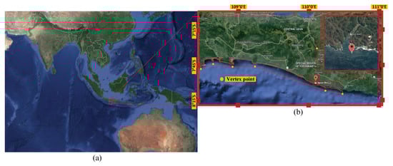 As mentioned above, the main areas of interest in this study are along the southern coastline of the central island of Java as shown in Figure 1a. The study area covers 108° E–112° E and 7° S–8° S and is approximately 3200 km2. The coastline data were collected from a database of Global Self consistent, Hierarchical, High resolution Geography (GSHHG), which was maintained by the National Oceanic and Atmospheric Administration (NOAA) The coastline data were edited using the Geophysical Data System-Next Generation (GEODAS-NG), the Geographic Information System, and the MIKE Zero software. The simulation domain is shown in Figure 1b. The boundary of the study area was segmented into five straight lines, where the distance between each vertex point and the coastline is 5 km.