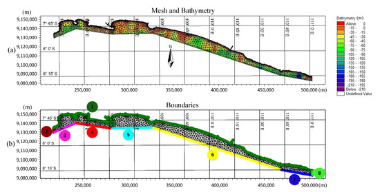 The boundary conditions are shown in Figure 2b. Mainly, in order to perform the computation, the boundary conditions have to be appropriately determined and correctly imposed. As shown in the figure, there are three types of boundary conditions used in this study: closed boundary (boundary 1), lateral boundary (boundaries 2 and 8), and wave parameter type 2 boundary (boundaries 3−7). The close or land boundary was applied for the coastline, which means that the water cannot flow across the boundary (no slips). The lateral boundary condition was set to the side lines where water can flow along the line (free slips). The wave parameter type 2 boundary was selected from the software with a format that varies in time along the line, and it requires four data types that are obtained from the ECMWF, which are the significant wave height, the wave period, the mean wave direction, and the directional standard deviation.