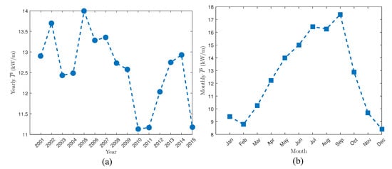 An annual analysis was conducted using the time-average value for each year, and Figure 4a shows the distribution of the yearly mean wave power from January to December. There are minor fluctuations in the mean wave power intensity from year to year. Figure 5a shows the time evolution of the average power from all the elements. It can be seen that the fluctuation is in between 10 and 13 kW/m, where the highest value occurred in 2005 with a value of 14 kW/m, and the lowest value occurred in 2010 and did not exceed 11.1 kW/m. This indicates that the mean wave power intensity is quite stable over the years.