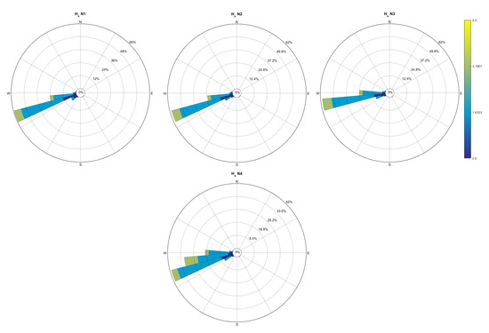 Polar diagram of yearly significant wave height for the prospective locations in Nusa Kambangan coast where N1 to N4 represent pin locations number 1 to number 4.