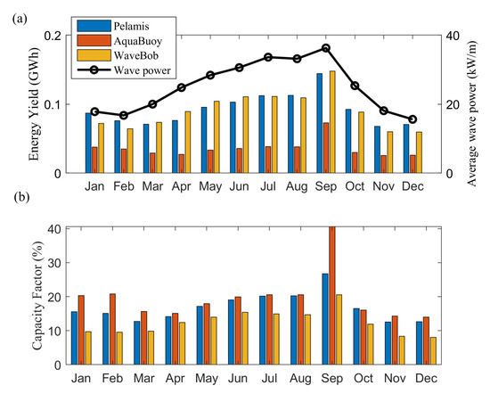 The performance of the three WEC devices at the second site off the coast of Penyu Bay; (a) the average monthly energy yield in GWh and (b) the WEC capacity factor.