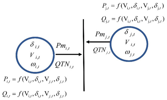 Each local system is associated with a time-varying voltage phasor of magnitude and phase . The discrete-time system dynamics ( is the time interval length) are governed by the equations of the virtual inertia controller, linking the node angle, , to the frequency difference to the nominal value ( − ):