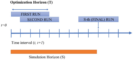The MPC scheme is defined in Figure 3. The optimization horizon (T) is the length over which the optimization problem runs and (S) is the simulation horizon. Both horizons (T) and (S) can be chosen according to the available information about uncertain parameters/forecasts (current states, forecasted demands, and renewables). In the MPC approach, in the first run, the solution related to the first time interval is considered. Then, uncertain parameters (new information from sensors in the field and new forecasts) are inserted in the procedure and a new optimization problem is run (second run), and so on for the whole duration of the simulation horizon (S). The MPC approach allows for updating new information when available and reducing uncertainties related to renewables’ availability and load forecasting.
