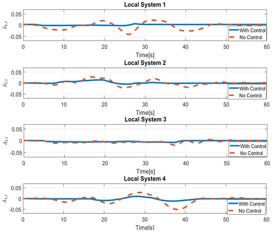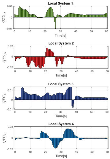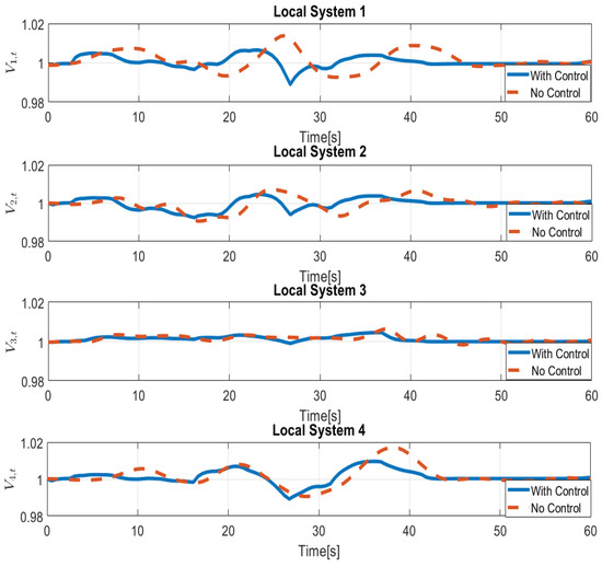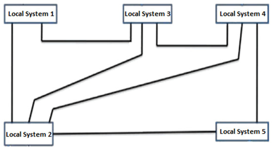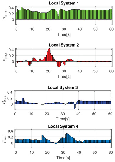 In this work, an MPC approach is proposed, taking into account uncertainties, and deriving an optimal solution that can be used in closed-loop and in real time. In the literature of power systems, similar control approaches can be found [34,35]. Delfino et al. [36] propose a multilevel architecture for interconnected microgrids in which the DC power flow equations are used at a higher level, an analytical solution emulates each microgrid, and the AC power flow equations are used at the lower level. Minciardi and Robba [37] formalize a decision model in which a stochastic optimal control problem is defined and solved. An optimal control strategy can be also found in Reference [38]. The authors consider the problem of load-frequency control in a multi-area power system proposing a hierarchical optimal robust controller. They decompose the overall problem in subsystems, solve the lower level through a control strategy, and finally, iteratively coordinate local systems. However, a detailed representation of the electrical network is not present. Annaswamy and Kiani, in Reference [39], include a discrete-time decentralized linear quadratic regulator (LQR) controller in a transactive architecture for hierarchical smart grids. In the present paper, with respect to References [34,35], a detailed representation of the electrical network is included in order to regulate voltage, and control active and reactive power. With respect to References [36,37], the decision problem has been solved analytically. In addition, References [34,35,36,37,38,39] do not consider frequency variations and equivalent inertia. Other optimal control strategies for the smart grid are present in the literature [40,41] but not in the area of interconnected local systems.