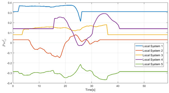 To show the effectiveness of the theoretical results presented in the previous section, the proposed control strategy has been applied to a modified IEEE 5-bus system (N = 5) [47], shown in Figure 4. The test network has been adapted to our problem through the following assumptions. Each bus corresponds to a local system, and, keeping the network topology unchanged, the values of cables’ resistance, Ri,j, and reactance, Xi,j, have conveniently rescaled to a distribution grid system (assuming base quantities of 10 MVA for apparent power, = 15 KV for voltage and = 50 Hz for frequency). Table 1 shows the detailed values of the line parameters Ri,j, and Xi,j for the case study.
