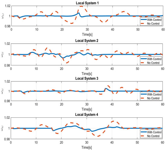 Nowadays, the control of interconnected local distribution systems is a challenging problem. In this respect, several papers focus on the definition and solution of optimization and control problems. A detailed survey [12] on multi-microgrids systems has been recently published, where operational management and control are quoted as challenging problems to be faced. Zheng et al. [13] propose a distributed model predictive control (MPC) approach using discrete-time Laguerre functions for load frequency control in multi-area interconnected power systems, in order to overcome the problems of computational burden and online optimization. The advantage of an MPC approach is that it allows for implementing a multivariable controller that controls the outputs simultaneously by taking into account all the interactions among system variables. Another strength of MPC (not used in our work, where a closed fast feedback is adopted) is that it can handle constraints. Khooban and Niknam [14] propose a heuristic algorithm and a fuzzy logic approach to tune parameters of classical proportional integral (PI) controllers for multi-area load frequency control. However, electrical models are not detailed. In the literature of microgrids, there are several interesting approaches based on MPC but related to the single microgrid, and thus not interconnected with other local systems. In Reference [15], a novel fractional-order model predictive control method is proposed to achieve the optimal frequency control of an islanded microgrid by introducing a fractional order integral cost function into the MPC approach. As in the present work, frequency regulation is attained, even if hereinafter we propose a more detailed system model, where active and reactive powers are present and voltage is regulated.