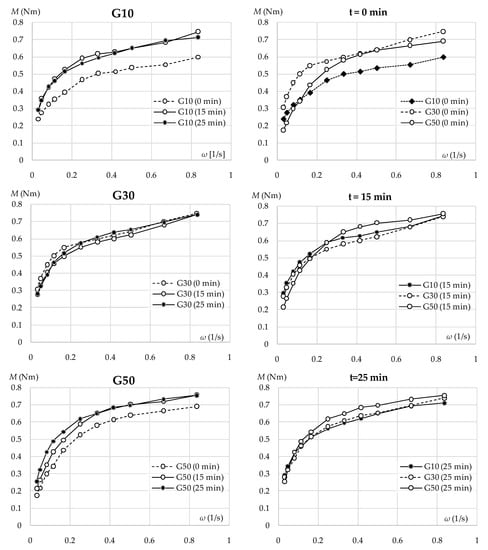 The equipment can be programmed for any speed–time procedure including the frequency of the data collecting during the experiment. The typical descending ramp technique was used, with a speed range from 50 to 2 rpm (0.84 ÷ 0.03 (1/s)), 11 steps, with a repetition of the highest speed at the end. The initial maximum speed was held for 20 s to obtain a proper breakdown of the structure and the following steps were held for 6 s. The flow curves were plotted in the M (Nm)—ω (1/s) units.