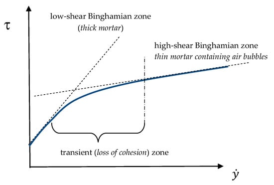 Additionally, f/b (fluid-to-binder ratio) was around 0.45, i.e., much higher than the value needed to obtain shear-thickening behavior, typical, e.g., for self-compacting concrete [32]. That is why at low shear rates the tested mixes behaved like typical low-consistency thick cement paste or mortar (see e.g., [28]), i.e., following the Bingham model (i.e., n = 1 in Equation (1)) with a comparatively low yield value and high viscosity. At higher shear rates cohesion loss was observed, granular skeleton loosened and some air was entrapped. As a result torque lowering was registered (comparing to the linear response). At the certain shear rate this phenomenon stabilized (i.e., there was no significant additional cohesion loss observed). That is why the flow curve again became close to the straight line, but with a higher theoretical yield value and lower viscosity, like for low paste content mortar due to paste suction into air bubbles [28,33].