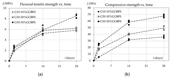 The flexural tensile strength and compressive strength results for all geopolymer mortars G10, G30 and G50 are presented in Figure 3.