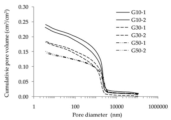 Total porosity was deducted from the cumulative intrusion of mercury pictograms presented in Figure 4. The pore size distribution of G10, G30 and G50 mortars at the age of 28 days obtained by MIP is presented in Figure 5. For each material two specimens were prepared.