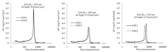 All geopolymers mortars G10, G30 and G50 present a bell curve shape with a clear one peak situated on 2230 nm, 2054 nm and 3127 nm. The peak was particularly pronounced for samples with a 10 wt% addition of GGBFS. The results show that in the case of tested geopolymers mortars macropores (>50 nm) were dominant. In the literature, the pore size distribution of geopolymer hardened pastes (binder with no aggregates) is most often presented as a bell curve with the maximum in a region of mesopores [40,41,42,43]. In case of the potassium-based geopolymer paste a maximum value was situated within the range of 8–30 nm [43] or 7–10 nm [40,42,44]. In turn, sodium-based geopolymer paste had the peak shifted toward 30 nm [41,44]. In our study the sand presence had a influence on porosity and pore-size distribution that is why the results differ from those presenting pastes [40,41,42,43] where the dominant pores diameters were situated in lower values.