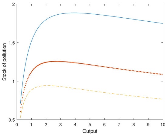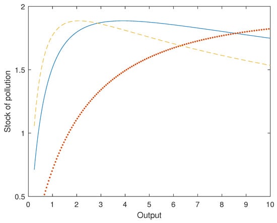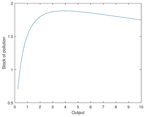 The most important result was that the maximum stock of pollution was always the same independently of the emissions parameter, but the threshold output value differed. As emissions efficiency increased, the threshold output value also increased. However, the timing changed. When emissions efficiency was high, the accumulation of pollutants was low as output increased. This was because emissions per unit of fossil fuel energy were also very low and little substitution between fossil fuel and renewable energy was produced. However, when emissions efficiency was lower, this accelerated the accumulation of pollutants, as more emissions per unit of fossil fuel were generated. However, this process also accelerated the substitution of “dirty” with “clean” energy, reducing the output for which the stock of pollution reached a maximum.