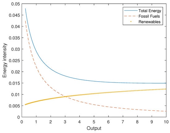 Figure 2 plots the steady-state values for energy intensity. Total energy intensity declined as output increased, a result consistent with the empirical evidence, indicating that the growth rate of output was higher than the growth rate of energy consumption, as a fraction of output growth was explained by aggregate productivity improvements. Energy intensity from the two alternative energy sources showed a different pattern. Whereas fossil fuel energy intensity reduced, renewable energy intensity increased. This result was derived from the changes in the energy mix. As output increased, fossil fuel consumption declined, whereas consumption of renewable energy increased, resulting in different changes in energy intensity depending on the energy source. However, the increase in renewable energy intensity was not problematic as this was a “clean” energy with no negative impact on the environment.