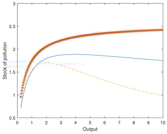 EKC. Change in the pollution damage parameter. Solid line: benchmark case, . Starred line: . Dashed line: .