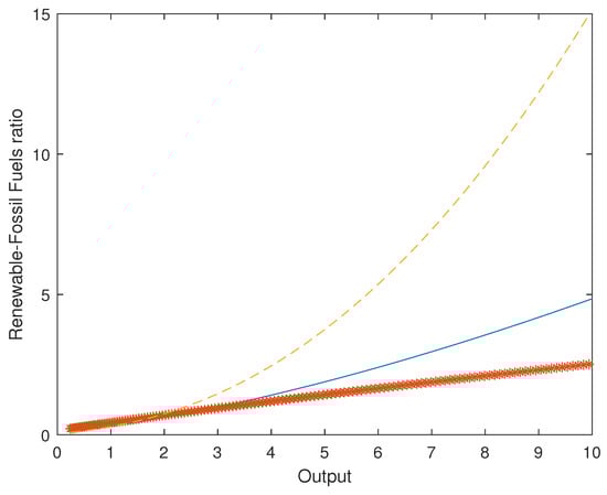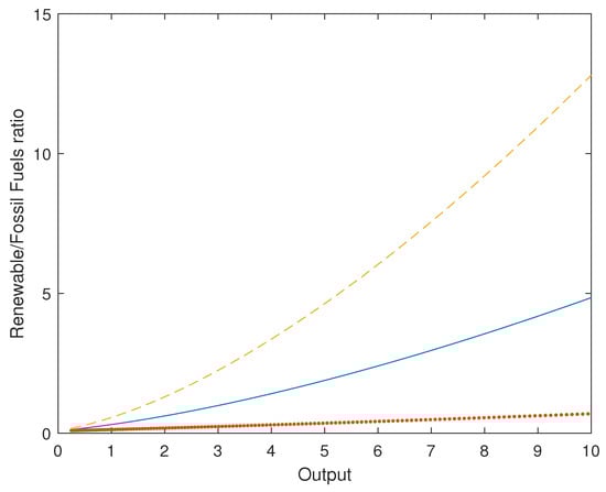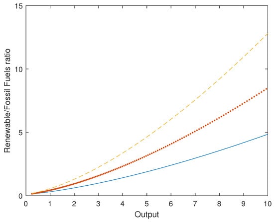 Finally, we studied the sensitivity of the EKC to the parameter representing the level of emissions per fossil fuel unit. This is an emissions efficiency parameter that can be regulated by environmental policies establishing limits to emissions. Figure 7 and Figure 8 plot the EKC and the renewable fossil fuels ratio for different values of the parameter reflecting the level of emissions per unit of fossil fuel consumed. We found that increasing emission efficiency had a positive effect on the environment for low levels of income, but not for high incomes, as this parameter did not change the accumulation process of pollution, but its timing. Indeed, as we increased the level of emissions efficiency, the negative slope side of the EKC disappeared, resulting in a positive relationship between environmental deterioration and output, for the range of income values in the simulations. Damage to the environment per unit of fossil fuel consumed was lower when emissions efficiency was higher, but this simply delayed the accumulation of pollution.