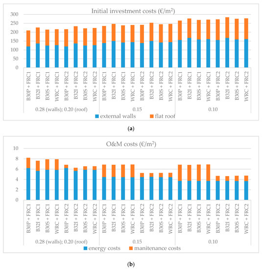 - Initial investment costs: in general, these costs include costs for activities of preconstruction phases and costs for construction of the building. In our case study, only costs for erecting all components of external walls and the flat roof are regarded. Therefore, these costs are calculated according to the principle of the unit price for all items needed to complete the whole component. Calculations of a unit price are based on predefined construction technology and geometric characteristics of the element. They utilize the norms for construction (masonry, reinforced concrete works, formworks, plaster) and craft works (façade and painting works) [54,55,56,61,62], and the average price of labour [63] and market price of materials per unit of measure [62,63,64,65,66,67,68]. Prices for some items are given according to the average market prices; all without VAT. Figure 3a) shows the initial investment costs per square meter of net heated floor area (Ah) for all variants. Costs for all preconstruction phases and construction of other building components as well as costs for installing window and door lintels are not analysed because we assume that they are the same in all variants. We also made preliminary calculations for all initial investment costs of construction (including construction, craft and installation works) for the basic variant of the building (as described in the chapter 3.1) and it does not include the values for the external wall and flat roof systems, totalling 665,504.42 € [69].