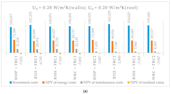 The cheaper construction of roofing in FRC1 variants leads to the initial investment costs being in general lower for all U-values; however, further substantial differences between variants of each wall structural system originate in the varying prices of bricks (the difference at U1 between the cheapest variant B30P and the most expensive B32I is 13.97%). The energy costs (as a part of O&M costs) between all variants and within each U-value do not differ significantly due to the predefined U-value of all envelope components. Greater deviation can be noticed only in variants with Porotherm 32 IZO PROFI bricks at U0, because this value can be reached already without thermal isolation, so the Uactual is lower as defined. However, maintenance costs change depending on the layers of envelope components. The calculation thus considers different finishing layers of external walls and roof systems, which affect maintenance costs in terms of the life span of façade and roofing. As a result, the maintenance costs for the façade do not differ much within each U-value, but they are characteristically different for roofing in its total 30-year period. For example, at U1 for variants with FRC2 (the life span is 30 years; the share of the new value is 25%) with regard to the variants with FRC1 (the life span is 20 years; the share of the new value is 30%) the NPV of maintenance costs is lower by 77.69 %, because this calculation also considers maintenance costs in roofing with FRC1, namely, in year 20. Consequently, the lifetime period impacts residual values which are lower in variants with roofing FRC2.