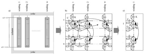 Modeling of power transformers is a complex procedure. A developed model should take into account all physical phenomena related to the performed analysis. Three groups of phenomena related to the analyzed frequencies bands can be found in the literature, i.e., low frequency, mid-frequency, and high-frequency (HF) models can be distinguished [,,]. The analysis of the overvoltage distribution in a transformer winding requires the use of the high-frequency transformer model, which should take into account magnetic and electric couplings between turns and frequency-dependent relationships such as the skin effect. The modeling of the magnetic core can be ignored due to the properties of the silicon steel and low penetration level of the magnetic field at higher frequencies. The HF transformer model can be divided into several subgroups depending on the topology and the input data. The first division which can be made is the finite element method (FEM) and RLC circuit models. FEM transformer models [,] are developed based on geometrical and material property data; due to the relatively large dimensions of the windings, computing power is the main issue in these analyses. The second group of transformer models is the RLC-based circuit models, which can be divided into transmission line modeling (TLM) models, black-box models, white-box models, and gray-box models []. The basis for the construction of the RLC models is the construction parameters of the transformer or the measured values and frequency characteristics.