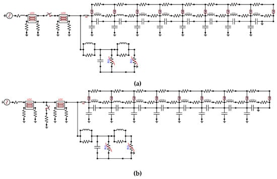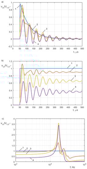 - closing the circuit breaker VCB connected to the cable line Lk and the HF transformer winding model, the variable length of the cable was changed in a range of 10 m to 60 km (Figure 5a);