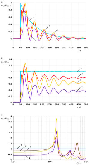Results of overvoltage waveforms u = f(t) and frequency characteristics u = g(f) inside a transformer winding at selected points x/l of the high voltage (HV) winding phase A, transformer model 20 kVA, 15/0.4 kV (Table 1): (a) waveforms during the action of normalized voltage impulse 1.2/50 µs; (b) waveforms during the action of a rectangular surge; (c) frequency characteristics u = g(f); 1, x/l = 0; 2, x/l = 0.18; 3, x/l = 0.33; 4, x/l = 0.62.